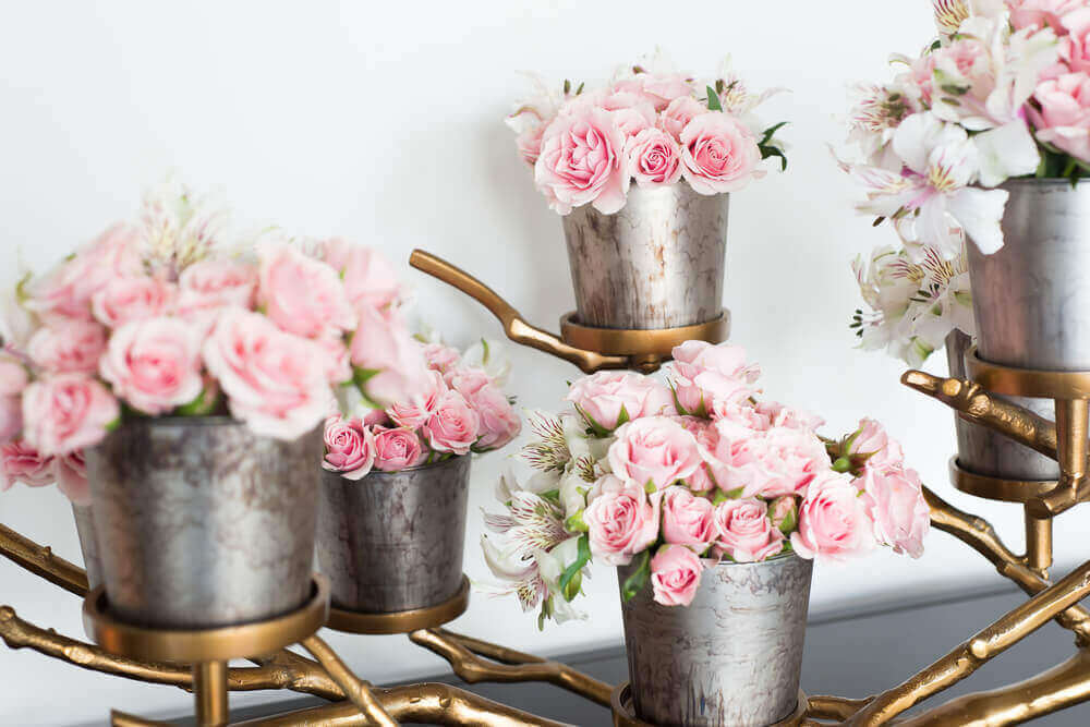 Hvis du ikke er så vild med kurve, kan du prøve med nogle i metal. Metalkurve er meget trendy, og de er ofte til stede ved mange specielle begivenheder. De ser fremragende ud med hvide fløjlsblomster eller pæoner.